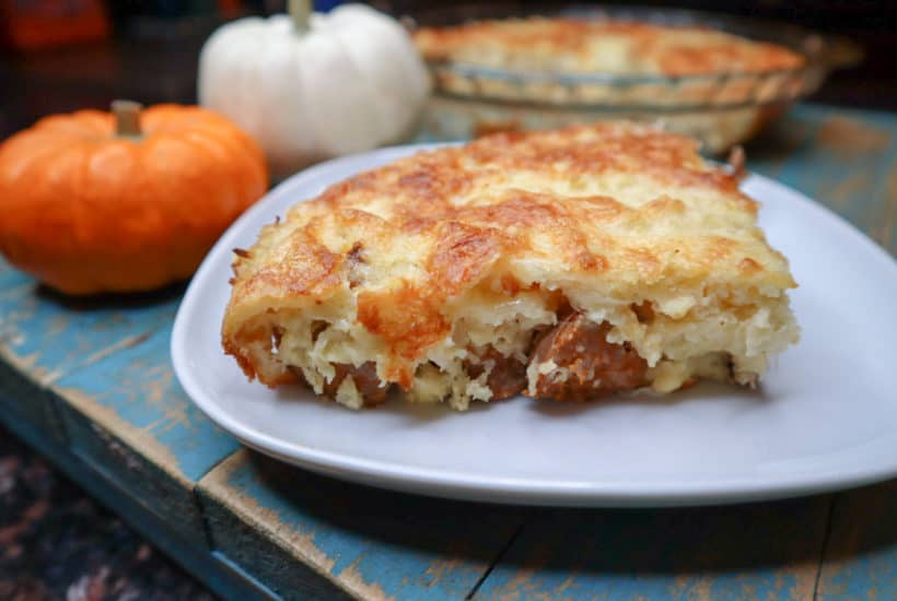 Hearty bratwurst, beer, tangy sauerkraut and nutty Swiss cheese are baked together in this delicious and savory Oktoberfest Pie.