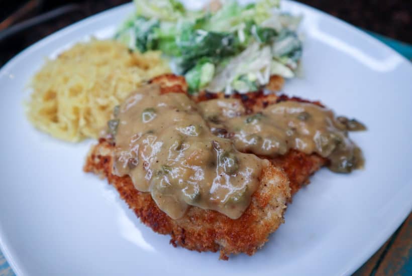 Thinly pounded pork chops, breaded and pan fried then drizzled with a tangy lemon caper sauce. An easy and delicious weeknight meal!