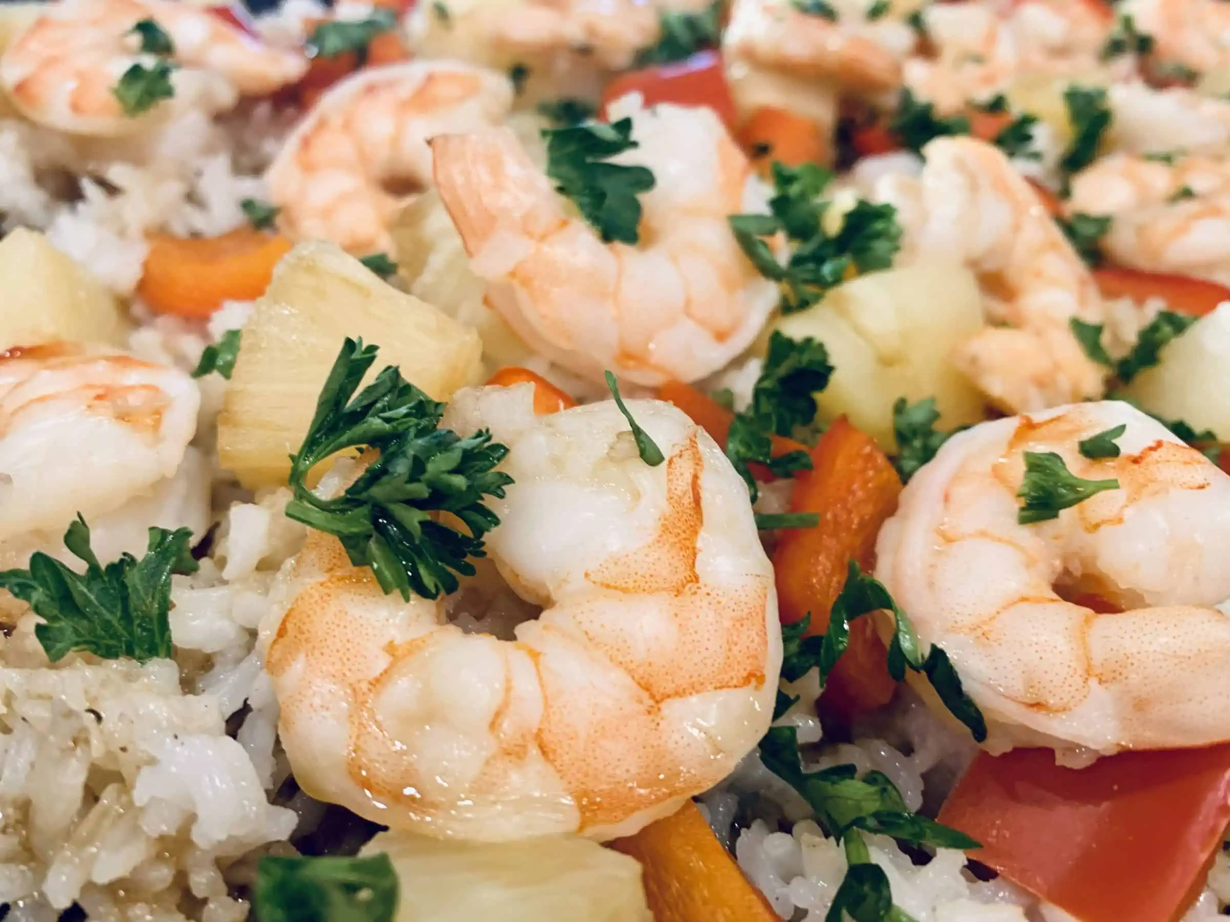 This meal is packed with shrimp and pineapple, served on a bed of precooked rice with veggies, and all tied together with an island inspired sauce.