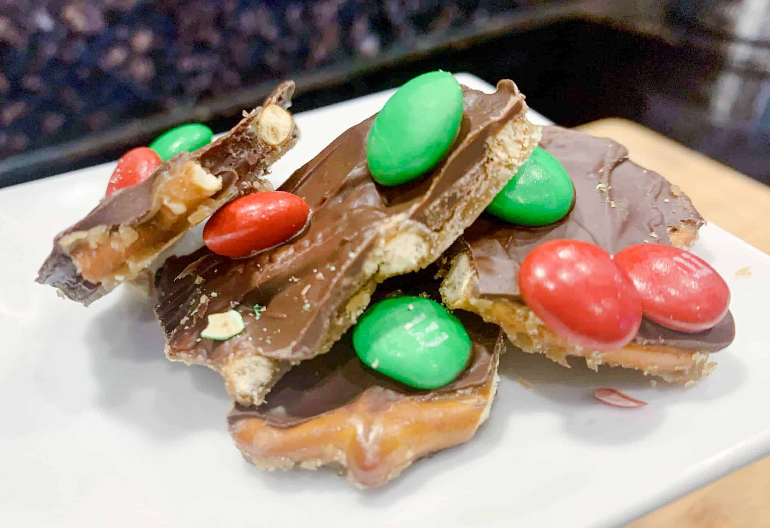 - Place the baking sheet onto the middle rack in the 350 degree F oven. Bake for 6-8 minutes until the caramel mixture begins to bubble and has spread out to fill the holes between the pretzels.